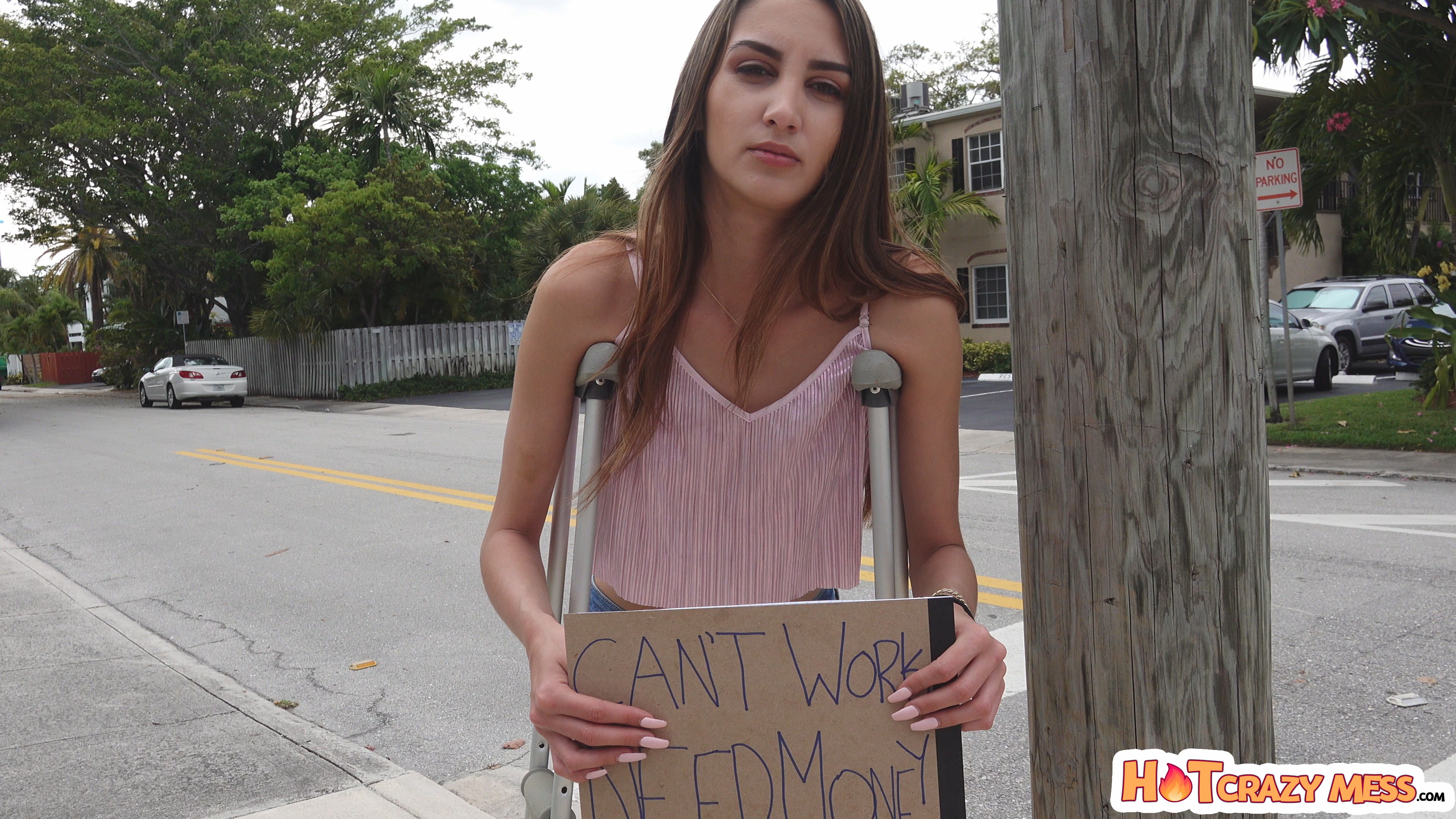 | Standing on the street corner with crutches and a sign begging for help, Natalia Nix is a sorry sight. She coaxes a kind stranger to give her a bunch of money to help with expenses. That could have been the end of it, except the scam artist made the mistake of letting the stranger see her walking off without so much of a limp. She gives him the money back and tries to call it even, but the stranger tells her it's fraud and he needs to call the cops. Natalia can't have that, so she takes his phone and puts it back in his pocket, then goes for his zipper.It takes some coaxing, but Natalia talks the stranger's dick out of his pants. Kneeling, she licks him like the sweetest candy and then dives in to a full-on BJ right in his back yard. It may be crazy, but the stranger doesn't want her to stop so he pulls her into a more private spot where they can continue. Natalia goes back to sucking, then gets to her feet to do a sexy striptease. She starts to masturbate, inviting the stranger to watch. When she's all warmed up, Natalia crawls over to the stranger and slides down on his fuck stick to ride him with her bare twat.Turning around, Natalia gives the stranger the perfect view of her firm ass as she rides him in reverse cowgirl. When she leans forward, he takes her invitation to go to town delivering a proper pussy pounding from behind. Then Natalia rolls onto her back and urges the stranger to keep on banging her until she cums one last time. Insisting that the stranger should get off, too, Natalia sucks and strokes him off until he nuts in her mouth. With that performance, she convinces the stranger not to call the cops on her. | ||